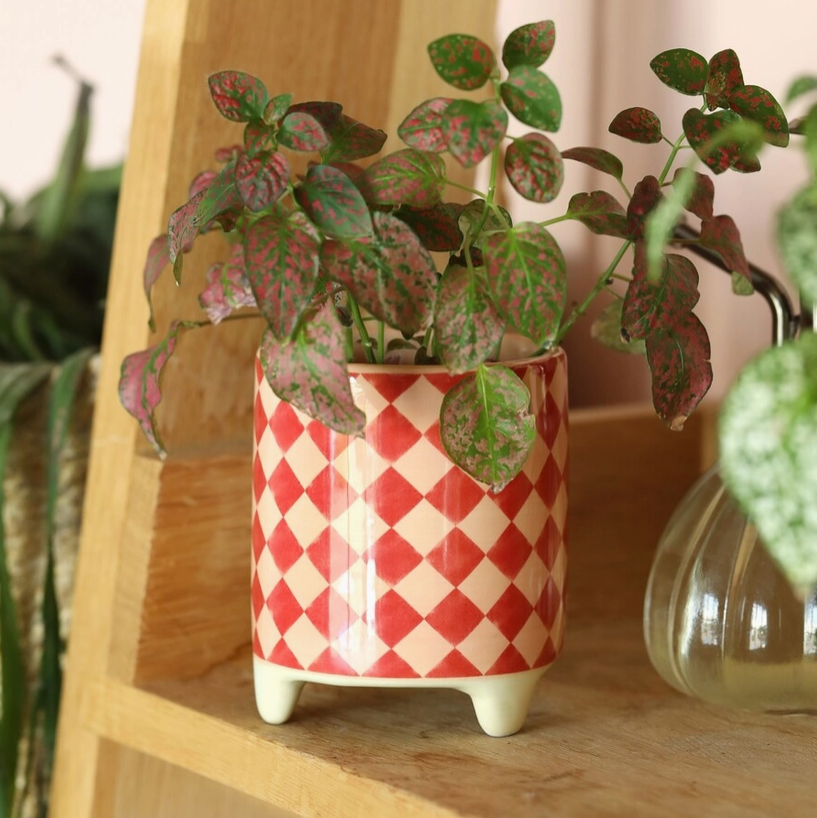 A mini plant pot that's ideal for succulents with a red and pink checkerboard pattern.