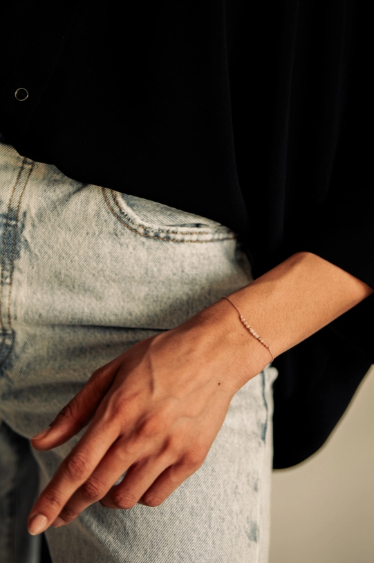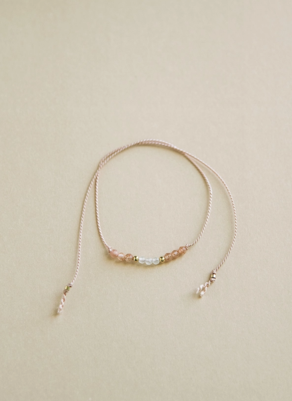 Beautiful, dainty and minimalistic string bracelet made from 100% silk string, made with 2mm faceted Moonstone, Sunstone and 14K gold filled beads, 11 beads in total. Special wish written on the the card. Recite it as you tie the bracelet on.