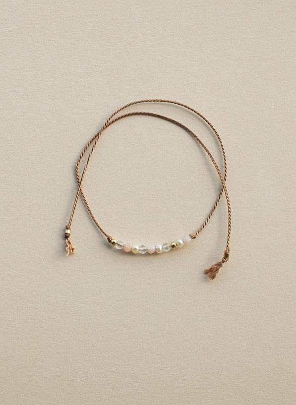 Beautiful, dainty and minimalistic string bracelet made from 100% silk string, made with 2-3 mm faceted Pearl, Pink Opal, Clear quartz Crystal, and 14K gold filled beads. 11 beads in total.