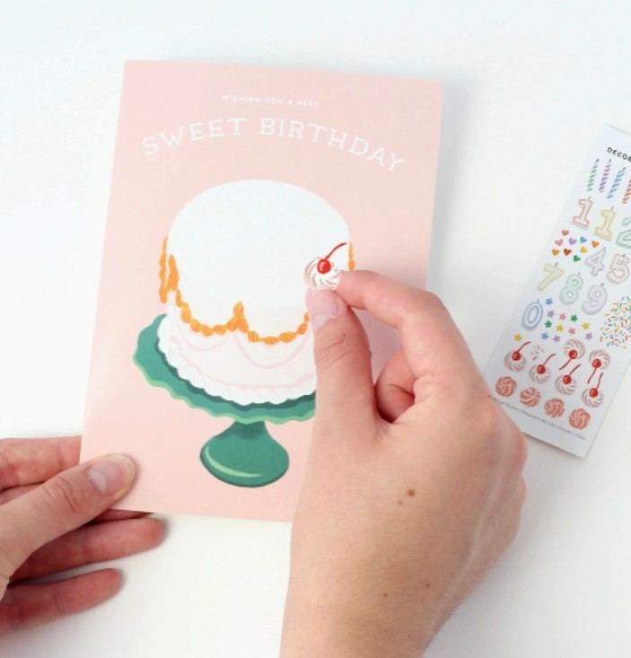 Decorate the cake! Our Sticker Scene Cards come with an adorable sheet of vinyl stickers to decorate the card and make it your own. This greeting card is coated with a special finish, making the stickers easy to adjust and reposition again and again! This card is fun for all ages.