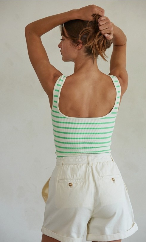 Check out our trendy striped tank style Bodysuit, perfectly paired shorts or skirts! Crafted from a soft knit nylon spandex blend, this chic bodysuit embraces your curves for a flattering silhouette.